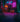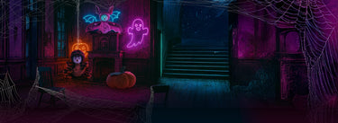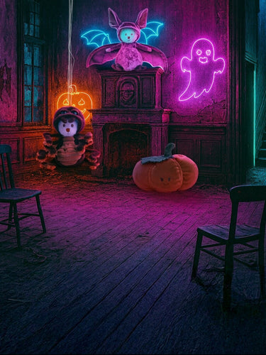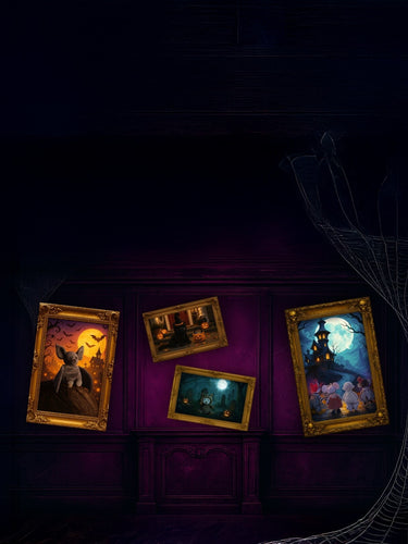 Four framed artworks on a purple wall with a dark, eerie atmosphere.