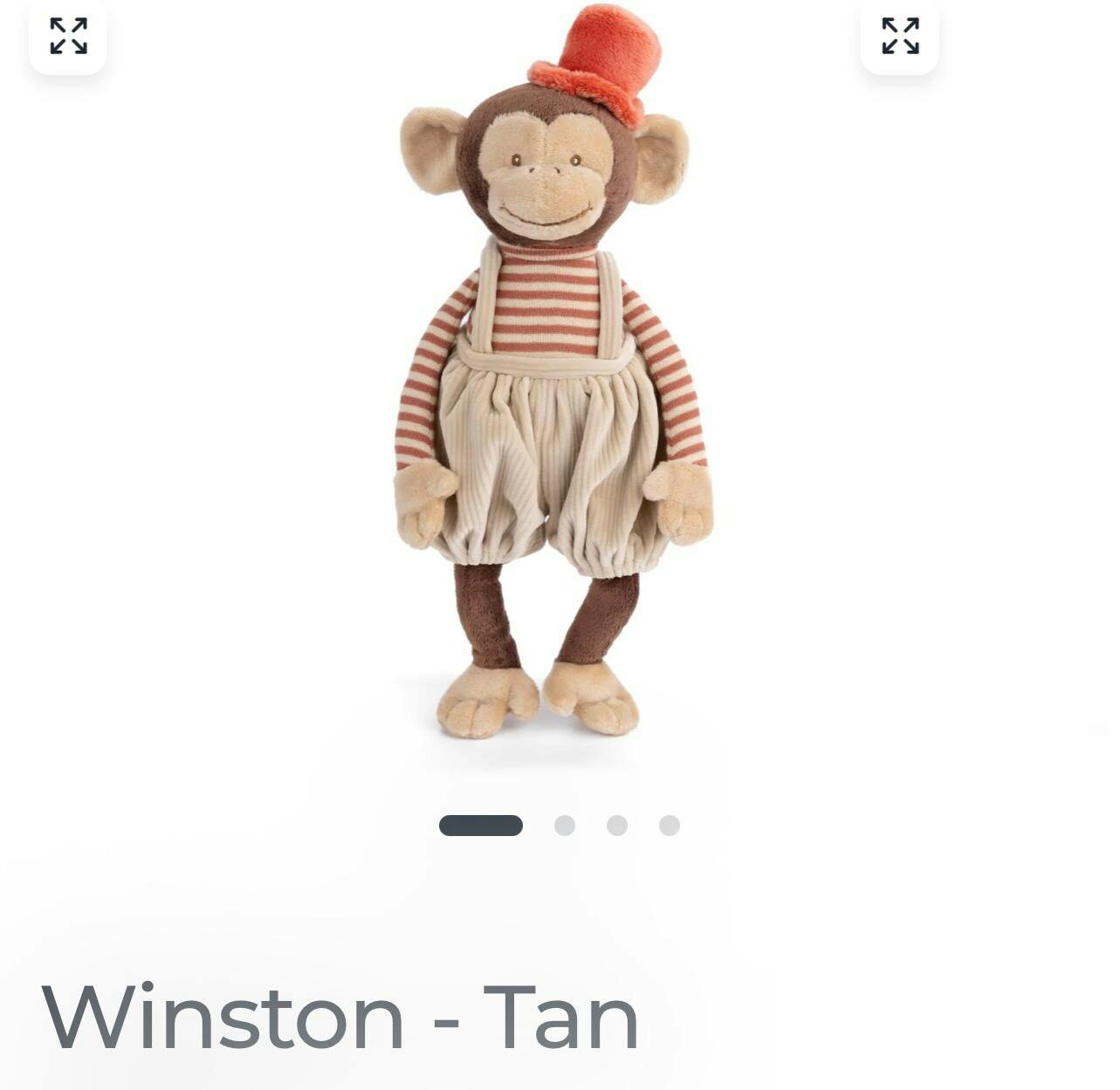 Winston the Monkey is a playful and dapper character. He stands out with his vibrant orange top hat, adding a touch of flair and sophistication to his look. His orange striped shirt brings a lively burst of color, perfectly complementing his tan overalls, which are both stylish and practical for all his monkey adventures. Winston is sure to capture the hearts of both young and old.